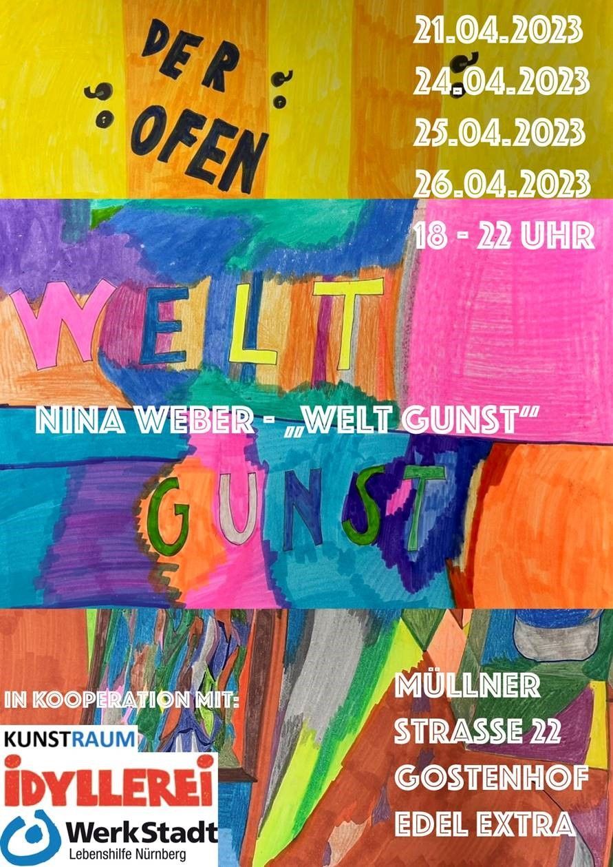 In „Weltgunst“ schenkte Künstlerin Nina Weber intime Einblicke in ihre persönliche, autistisch geprägte Lebensrealität, über den Frühling sowie vermeintlich alltägliche Begleiter. Präsentiert wurden Bildnisse individueller Wirklichkeiten im Umgang mit verschiedener Informations- und Wahrnehmungsverarbeitung. Die Ausstellung wurde bestens kuratiert von Lina Grün.