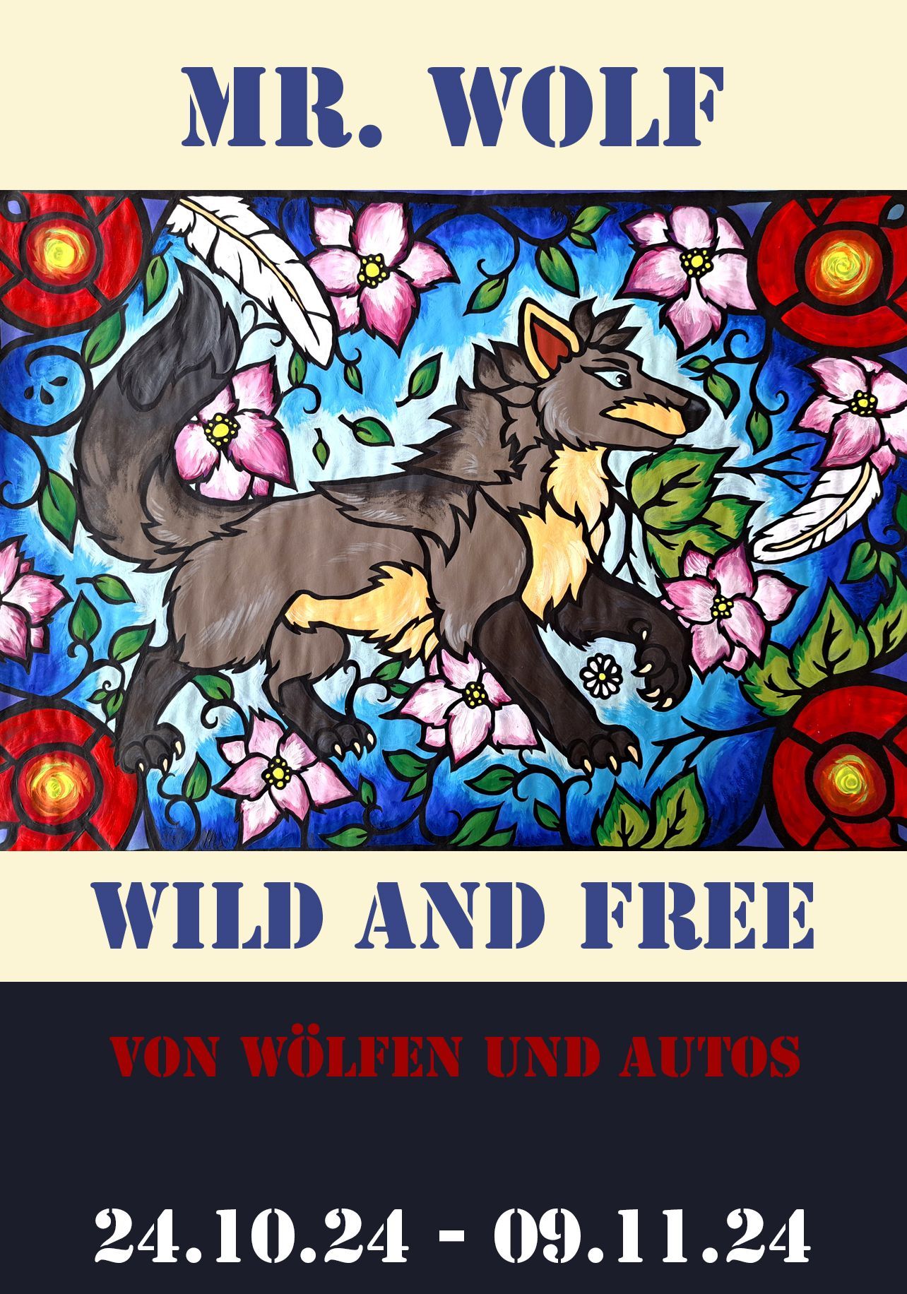 is the title of Mr. Wolf's first ever solo exhibition. Hard to believe for an artist who has been working day and night for two and a half years, successfully trying out and applying almost every technique. In addition to paintings and drawings, you can also see his wearable masks made of fabric and fur, with which he transforms from human to wolf-man in a matter of seconds, as well as smaller and larger wolf figures to amaze and make you smile. The artist does not want his works to be taken quite so seriously, as there are plenty of projection levels that testify to a profound sense of humor and delightfully spare no cliché.